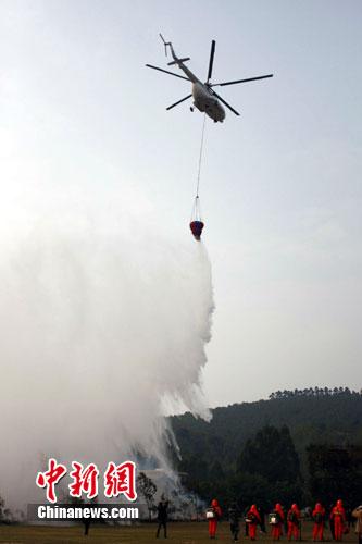 國家林業局西南航空總站派出一架“米171”直升機參與模擬火場撲救演練。據了解,國家林業局西南航空總站共配備了3架“米171”直升機用于森林火災撲救。