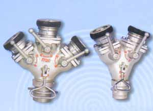 分水器裝置于水帶干線上; 每一個分水器有一個進水口和幾個出水口,可以同時使用,也可以分別使用; 出水口上均有閥門裝置,可以隨時關閉,控制水流,便于增加和調換支線水帶.