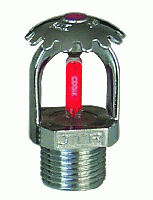 直立型噴頭是由噴頭框架、溫感元件、密封件、濺水盤等組成,其中噴頭框架是采用銅合金材質的精密鍛壓、外表層進行鍍鉻拋光的制造工藝,使其具有框架強度高、耐腐蝕性強、外觀精美的特點。溫感元件(玻璃球)具有動作可靠,反應速度快。密封件具有抗老化、耐腐蝕、密封性好的性能特點。直立型噴頭向下噴灑的水量為80%~100%。玻璃球的直徑為5mm[RTI 大于50(m·s)0.5且小于等于80(m·s)0.5]。依據玻璃球動作的溫度不同而分為多種溫級噴頭。
